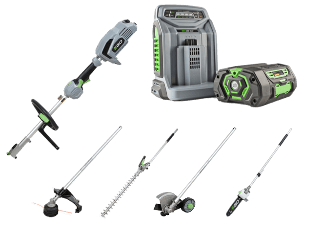 The EGO Power+ multi-tool is the outdoor power tool you can’t do without, and this ultimate multi-tool kit gives you a perfect platform to tackle every garden task. The PH1400E power head is perfectly balanced to give you a comfortable and easy experience. The line trimmer allows you to trim grass along fences and walls with precision, and includes our Rapid Reload head for easy line replacement. If you need to remove thicker, overgrown areas, you can simply click in the brush cutter attachment to complete your task.When it comes to finishing the lawn, the EGO edger attachment has quick depth adjustment and a handy guide to make achieving a perfect edge easy. Use to neaten edges along paths, driveways or flowerbeds.The hedge trimmer attachment will tackle high or low hedges with ease, plus the head has 12 adjustable angles to suit the job at hand, and allows for compact storage. The sharp diamond ground blades are no match for conifers, beech, holly or laurel.With the pole saw attachment, the 25cm guide bar works with the 15.0m/s chain speed to allow you to slice through tree branches quickly and efficiently. To power the tools, a 5.0Ah battery is also provided within the kit. EGO’s 56V ARC Lithium™ technology is perfectly optimised to provide the best balance between required performance and usable power, which means it performs to its highest level for every tool. And when it’s empty, it will take only 40 minutes for a full recharge.Includes: PH1400E – Power head STA1500 – Line trimmer attachment HTA2000 – Hedge trimmer attachment PSA1000 – Pole saw attachment EA0800 – Edger attachment ABB1203 – Brush cutter blade BA2800T – 5.0Ah battery CH5500E – Rapid charger